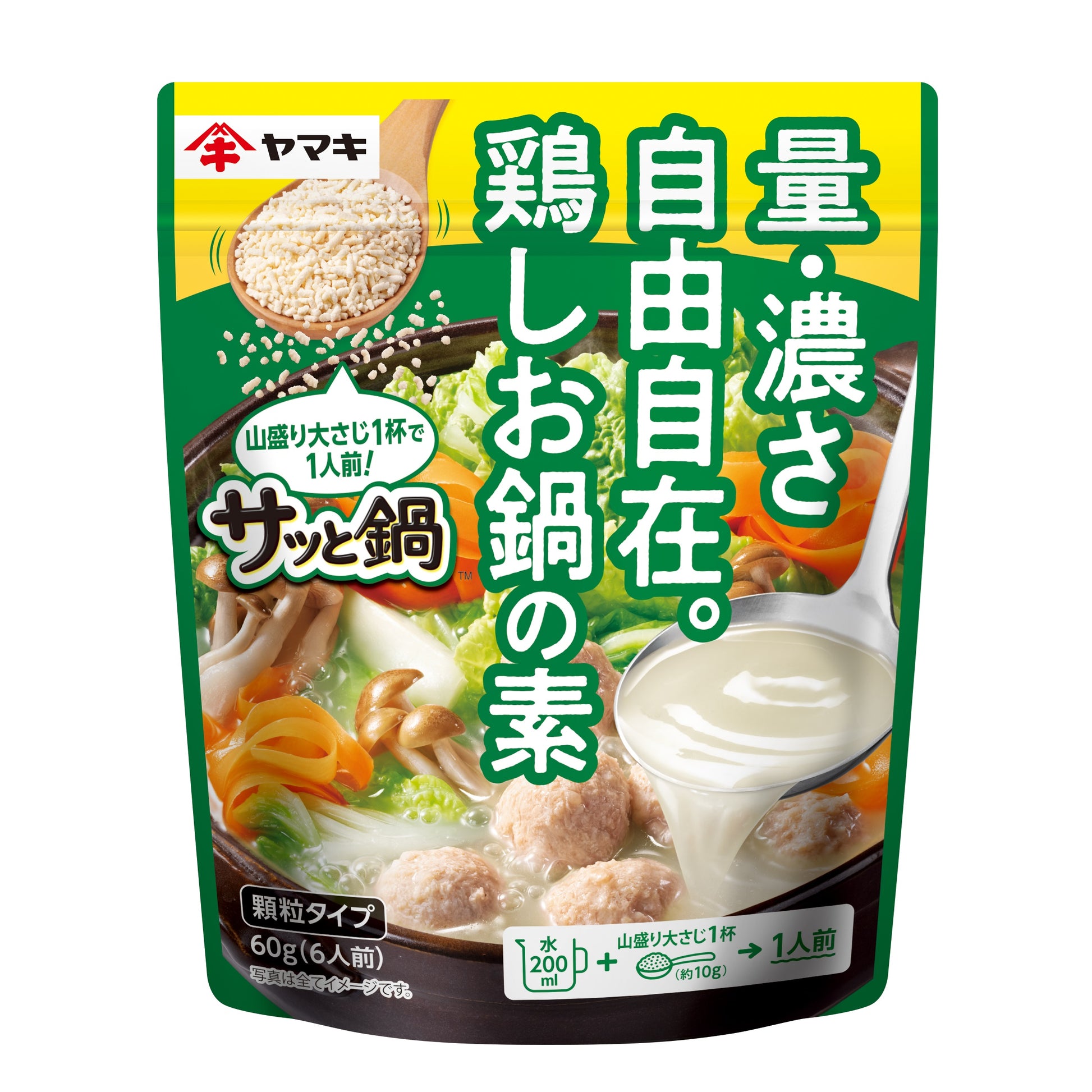 鶏と野菜のうま味を効かせた、白湯(パイタン)ベースの鍋つゆの素です。1人前=山盛り大さじ1杯(約10g)で、食べる人数や好みに合わせてつゆの量や濃さを自由に調整できます。また、溶けやすい顆粒タイプなので、食べている途中でつゆが足りない時や味が薄まった時も、“サッと”加えるだけで、手軽に味を整えることができます。